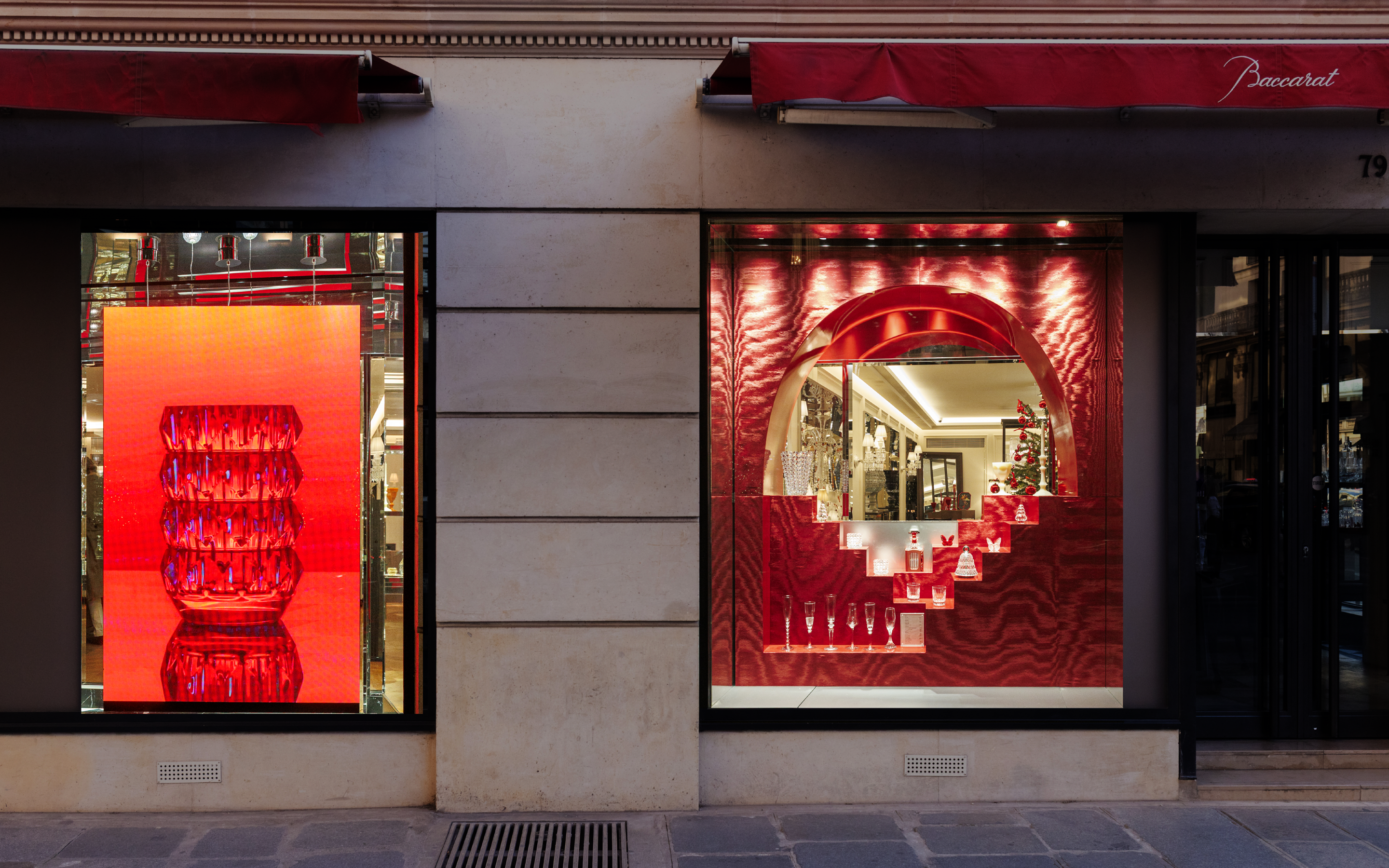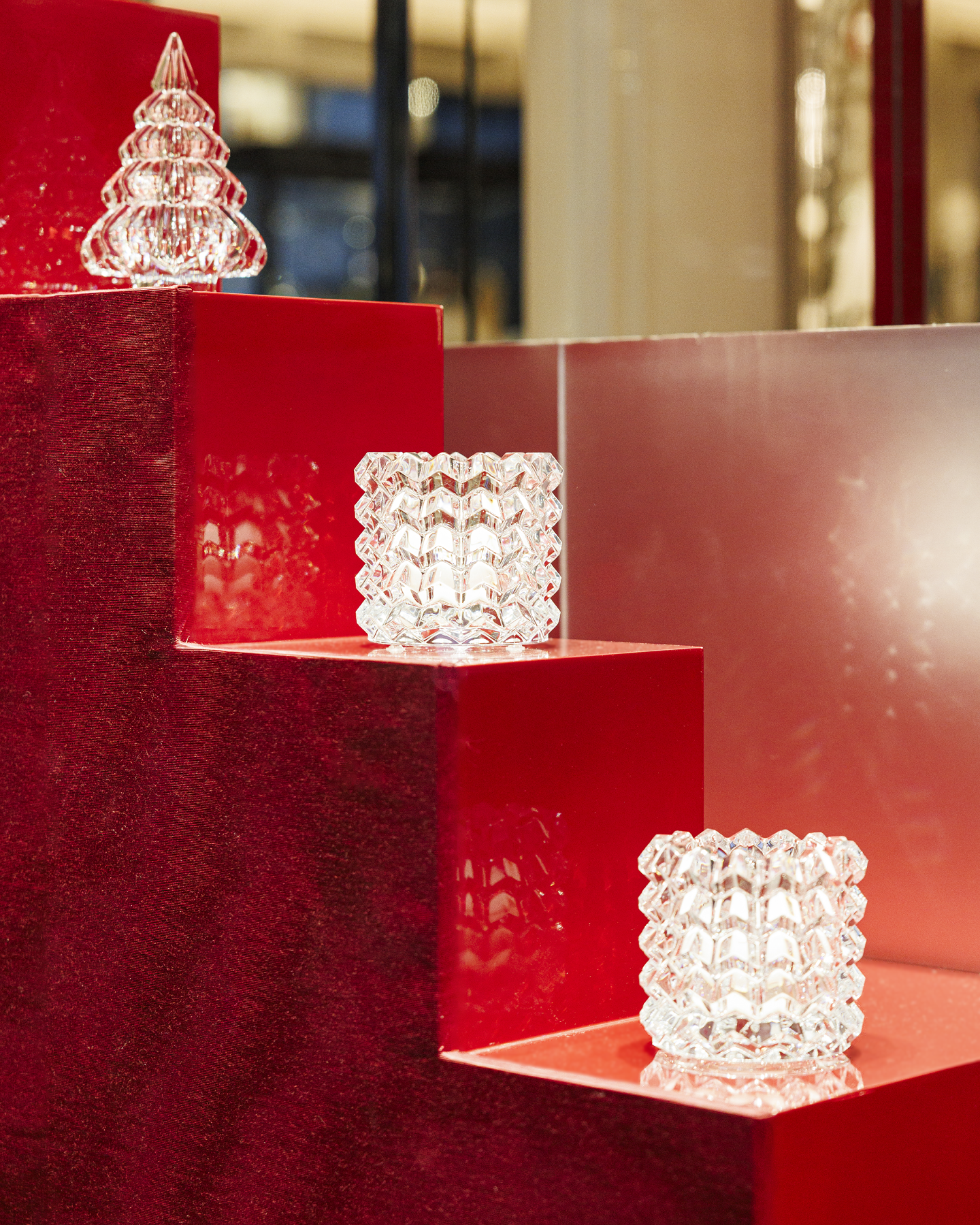 Les reflets du moiré et l'intensité du rouge créent un contraste saisissant, invitant les passants à plonger dans la magie de Noël.