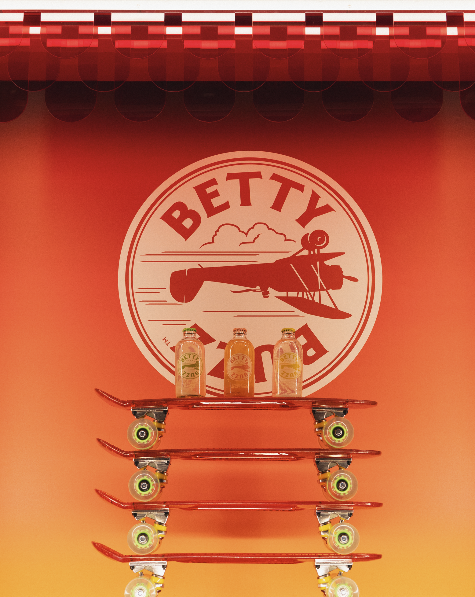 Pour son premier projet à La Grande Épicerie, Atelier UTO s'associe avec la marque Betty Buzz de Blake Lively pour une création de vitrines et l’aménagement de la terrasse. Ce projet met en lumière une collection de boissons aux saveurs d’agrumes pétillantes et rafraîchissantes, incarnant le thème « Transparences graphiques et bayadère estival ».