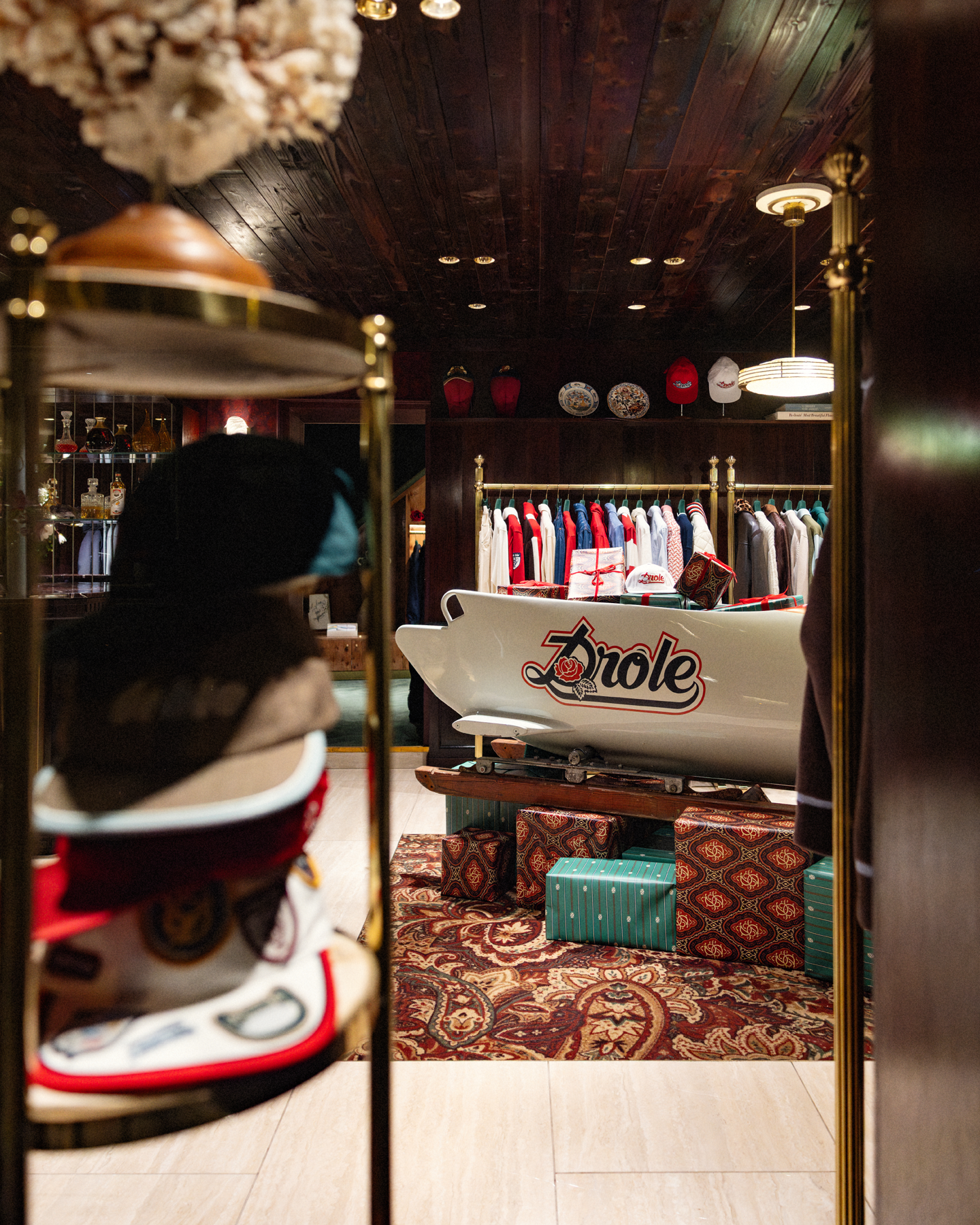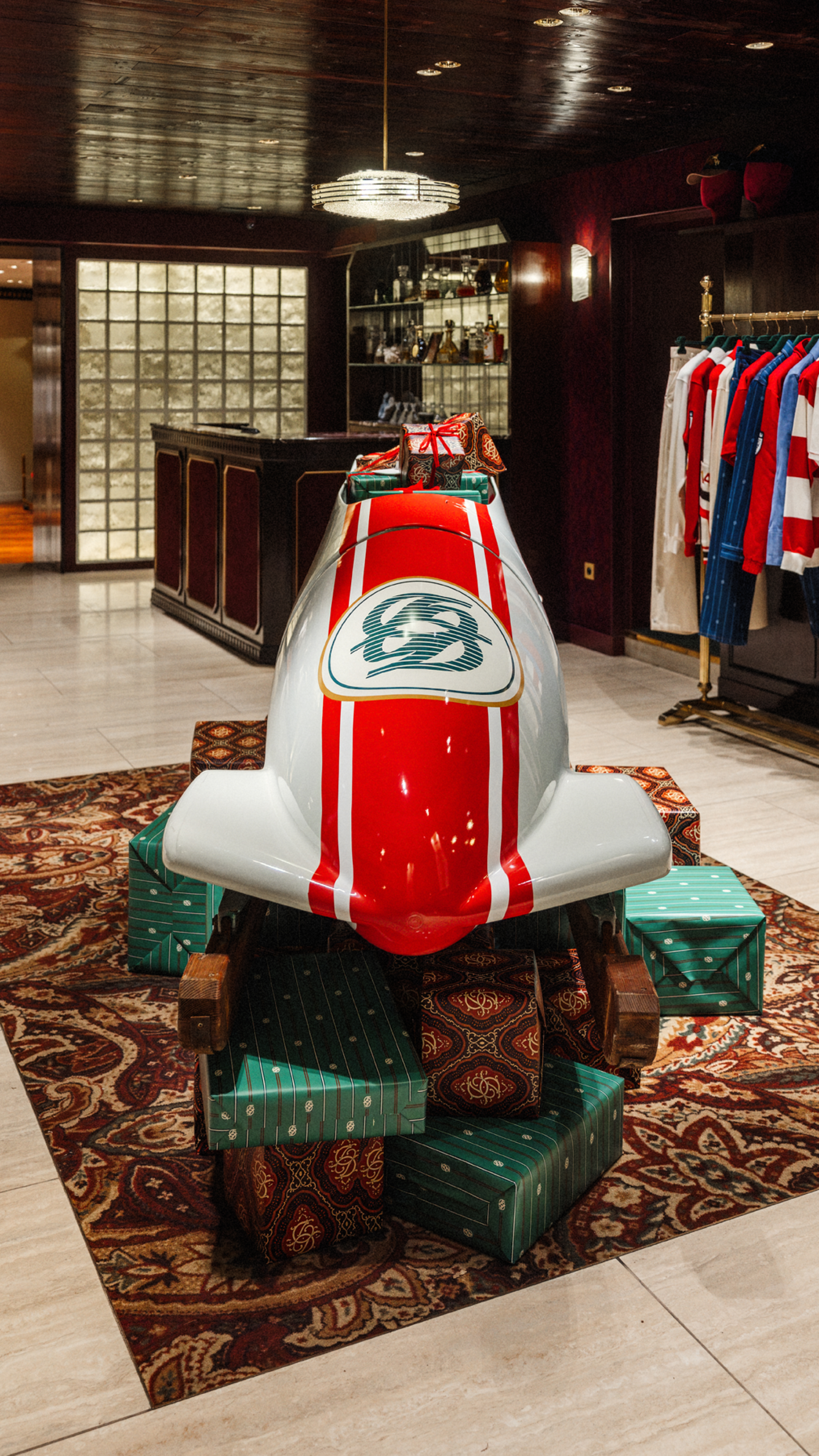 Pour cette installation de Noël, nous avons personnalisé un bobsleigh aux couleurs et logos de la marque. Entouré de paquets cadeaux et rempli de pièces emblématiques, ce décor original met en lumière l'opulence et l'élégance de l'après-sport hivernal.