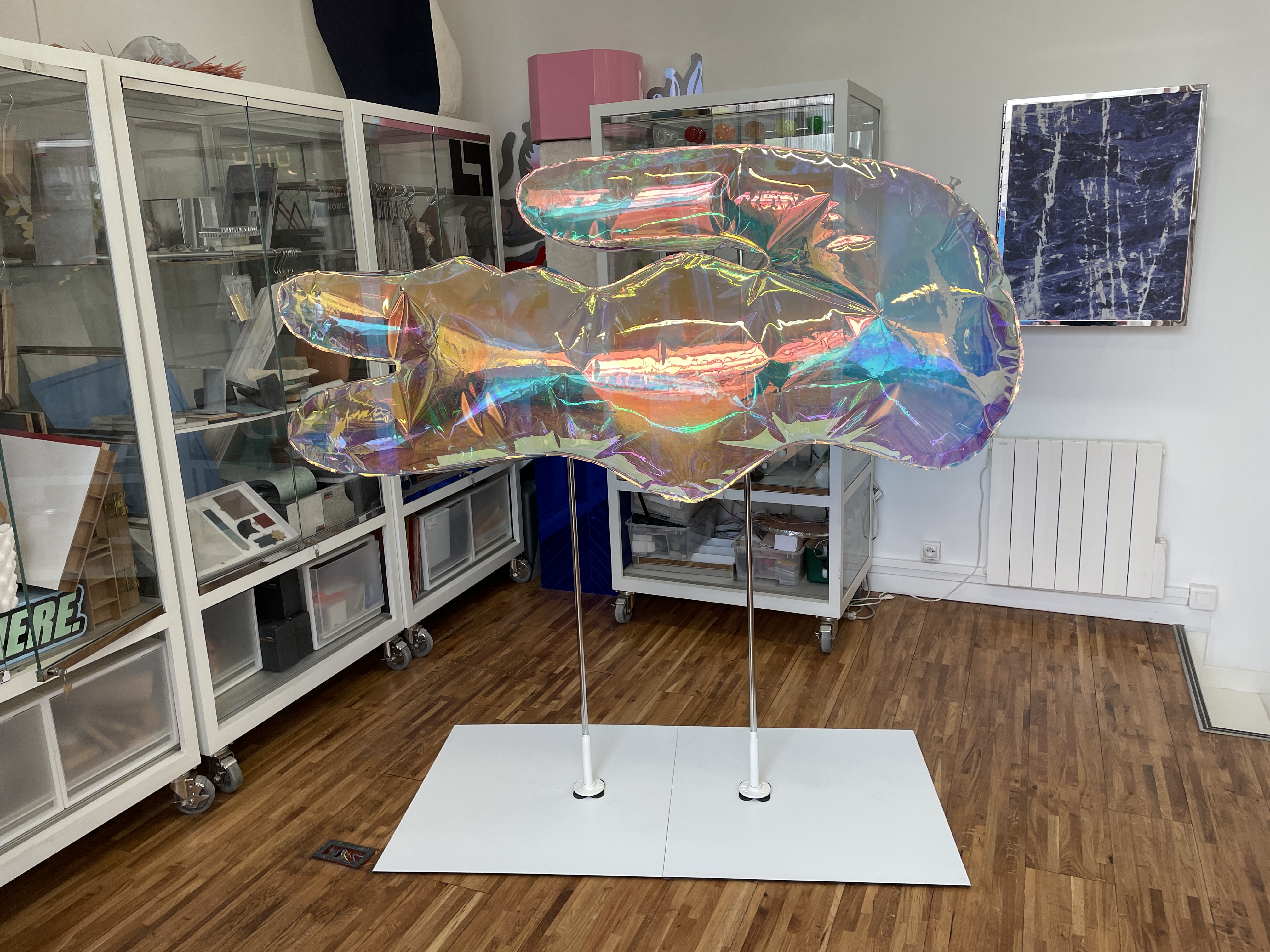 Vitrines estivales, prototype de ballons gonflables en matière dichroïque. Ils ont finalement servis en vitrine dans la boutique des Champs-Elysées