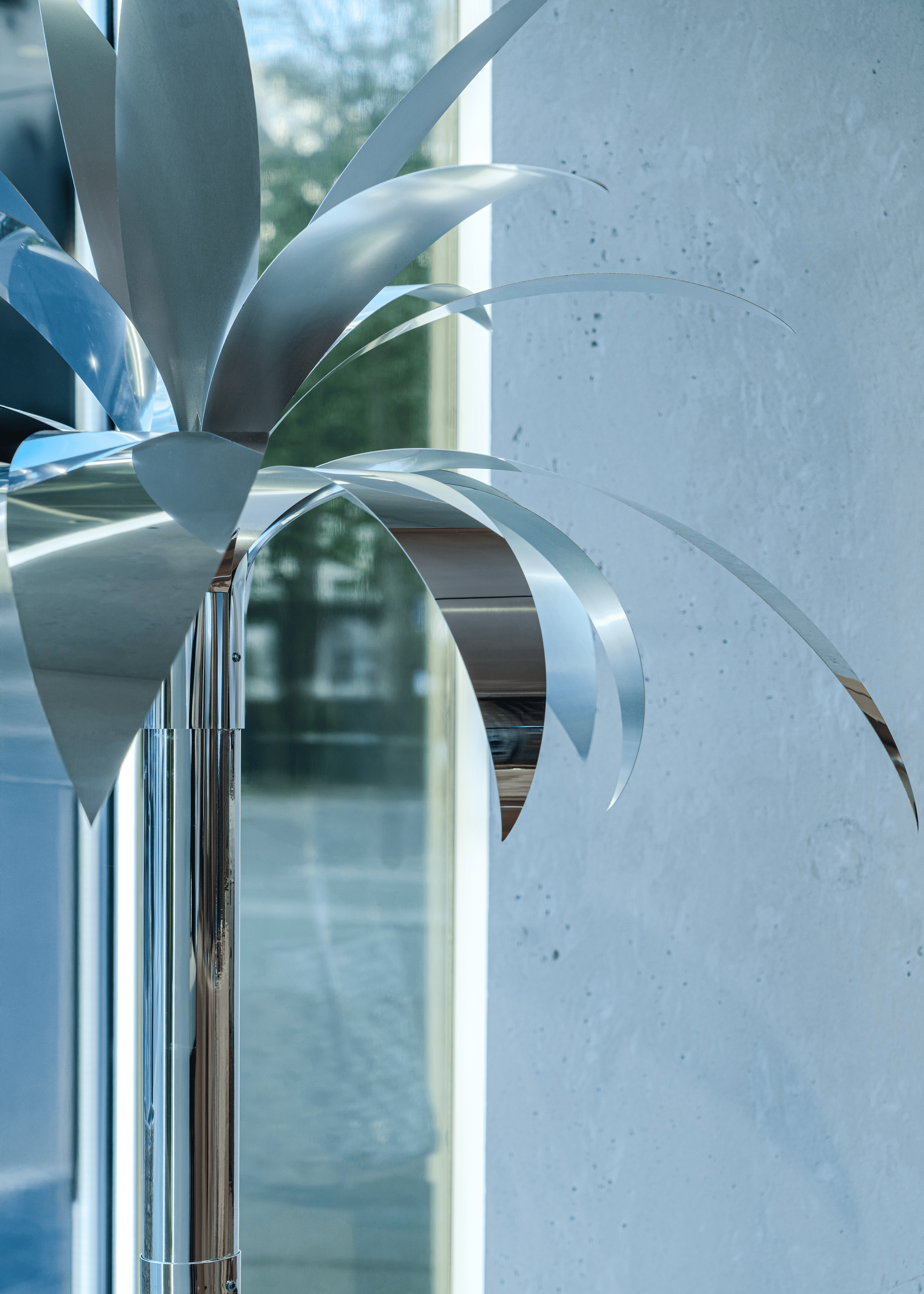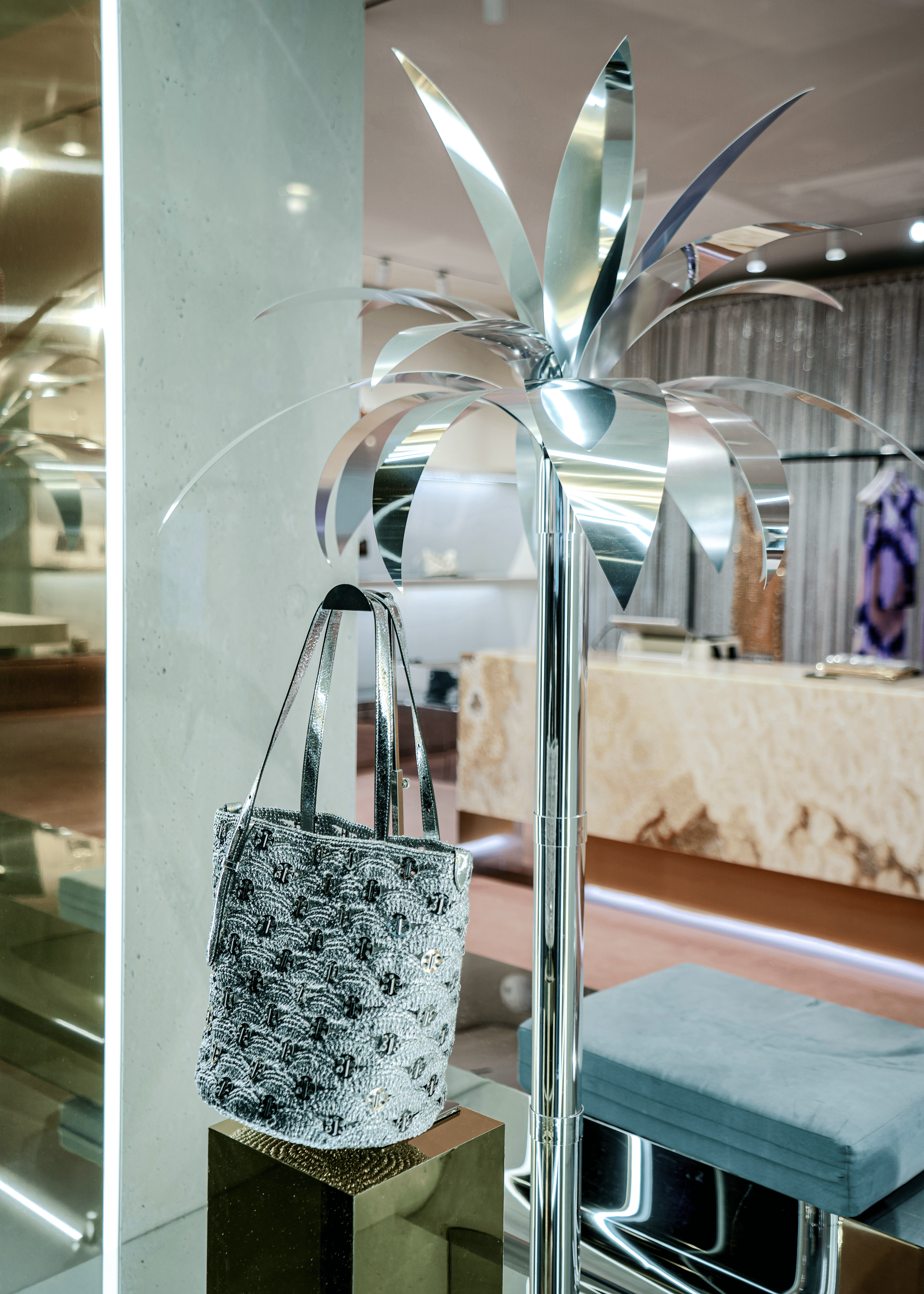 Une série de palmiers sur pied, aux teintes argentées et dorées métallisées, créée sur mesure. Ces installations servent à la fois de supports décoratifs et de présentoirs fonctionnels pour les sacs iconiques de Rabanne, tout en reflétant les premiers rayons du soleil estival.